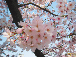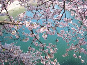 日本的樱花开放大致分为“蓓蕾、初开、五分开、七分开、满开、开始凋落和开闭”等阶段。到达日本东京时,樱花基本凋落,有些樱花树上已经长出了嫩嫩的叶子。但幸运的是,在日本皇宫护城河及外苑周边,依然看到了晚樱随风飘零的身影。