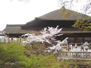 观赏清水寺的樱花,除了在“清水舞台”俯瞰环绕周边茂密的樱花林之外,顺着本堂左侧的樱花步道下行,沿途可看到细雪般的樱花。而回首眺望本堂和“清水舞台”的形影,只见如雪的樱花簇拥着古朴的屋宇,好似建在半空中一样,古庙的沧桑与花朵的娇嫩相辉映,充满着凄冷的美感。