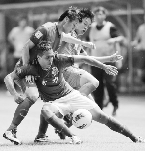 | 5月13日,在中超联赛第十轮比赛中,广州富力队主场以2:1战胜河南建业队。图为富力队球员达维(前)与建业队球员拼抢。 新华社发 |