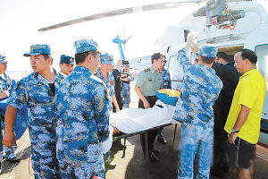 在救治过程中,患者多次出现休克症状,医护人员当机立断进行了数次抗休克治疗,经过整整一晚的抢救,使患者症状得到基本控制。经紧急协调,南海救助局派遣的直升机也于今天上午8时抵达西沙永兴岛,简短交接后,该患者被迅速转运至解放军425医院进行进一步的救治。