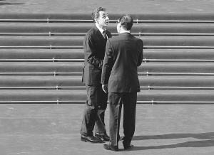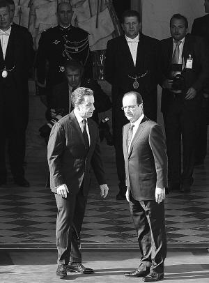 | 离任总统萨科齐(左)在交接仪式前迎接当选总统奥朗德。 新华社发 |