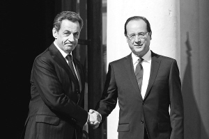 | ↑ 奥朗德(右)与离任总统萨科齐握手。 新华社/路透 |