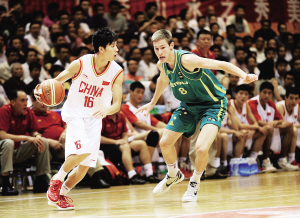 15日,在西安举行的国际青年男篮四国赛首场比赛中,中国国家青年男篮以81比82不敌澳大利亚国家青年男篮。图为中国国家青年男篮队员杨林祎(左)在比赛中进攻。 新华社发