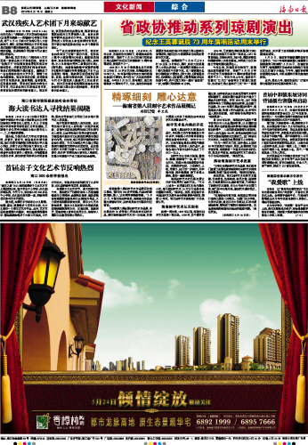本报海口5月15日讯 (记者陈耿)今年以来,在省政协的推动下,琼剧演出活动源源不断,而将于5月20日在海口市府城三角公园举行的纪念王英蓉诞辰73周年演唱活动,便是其中之一。 1939年5月20日是琼剧名旦王英蓉女士的生日,16岁从艺的她,在梨园活跃达56年之久。50年前与陈华先生主演的琼剧电影《红叶题诗》,至今仍为广大戏迷所津津乐道。今年的5月20日,即本周日,是王英蓉诞辰73周年的日子,为此,省政协和省琼剧票友协会将在海口市府城三角公园举办演唱活动,缅怀这位为琼剧事业作出突出贡献的艺术家。 据介绍,演唱活动于5月20日上午9时30分至12时举办,届时,将有大批琼剧界人士和众多戏迷,一起演唱王英蓉女士的7部代表剧目中的折子戏。这7部琼剧的名称分别是《红叶题诗》、《张文秀》、《秦香莲后传》、《林攀桂》、《孟丽君》、《春草闯堂》和《红色娘子军》,其中《张文秀》一剧的“偷包袱”一折,演唱时间将持续40分钟。 1956年,王英蓉在传统琼剧《张文秀》中因成功饰演王三姐而一举成名;1957年晋京演出,受到毛泽东、刘少奇、周恩来等党和国家领导人的亲切接见,并拜谒了田汉和梅兰芳等我国戏剧界名人。 今年以来,在省政协的推动下,琼剧演出活动源源不断,而将于5月20日举行的纪念王英蓉诞辰73周年演唱活动便是其中之一。早在今年上半年,省政协已在陵水“三月三”会场举办了琼剧汇演活动,在府城三角公园举行了庆“五一”琼剧惠民演出,并开展了送戏到澄迈等多场琼剧演出活动。 5月23日,省政协和省琼剧院还将在文昌举办“2012年海南省琼剧汇演暨第三期琼剧传习培训班”;5月26日,在省政协支持下,省琼剧票友协会将送戏到海口市美兰区三江镇下乡演出;下半年,省政协将帮助琼剧走出岛外,与其他剧种开展交流演出活动。 此外,最近几年,省政协还在广泛地开展对琼剧史料的征集和宣传工作。 |