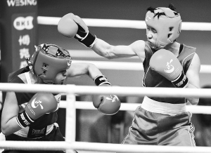 16日,在秦皇岛举行的2012年国际拳联世界女子拳击锦标赛暨伦敦奥运会资格赛51公斤级四分之一决赛中,任灿灿(右)战胜美国选手马琳·埃斯帕扎晋级四强,获得伦敦奥运会参赛资格。 新华社发