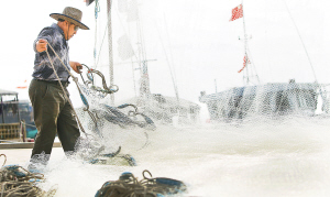 | 5月16日,临高利时捕捞专业合作社社长林海深整理晾晒渔具,该县1961艘渔船已归港休渔。 本报记者 苏晓杰 摄 |