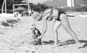 5月16日,一对俄罗斯母子在三亚市大东海海滩上戏水晒太阳,同时将周边数百平方米海滩上的垃圾清理得一干二净。气温日渐升高,三亚公共海滩成了国内外游客们消暑的好去处。 本报记者 苏建强 摄