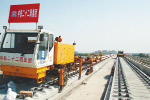 5月16日,工人操作机器在京石高铁铺轨现场施工。 由中国铁建二十二局集团等单位负责施工的、全长280公里的北京至石家庄高铁工程进展顺利,将于6月份全线铺通。 新华社发