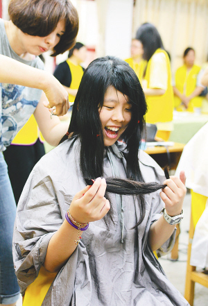 5月16日,一名女中同学拿着自己刚剪下的一缕头发。 当日,台北景美女中举办“千丝万缕情 发香伴癌友”捐发公益活动。数十名长发飘飘的女同学将自己的头发捐赠给因癌症治疗脱发的患者,为他们制作假发。 新华社发