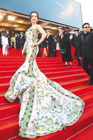 | 戛纳国际电影节开幕式上,中国演员范冰冰梳着唐代双垂鬟、身着一件多彩仕女纹白色长裙亮相。 新华社发 |