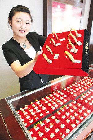 5月16日,江苏省赣榆县一家金店营业员在展示黄金饰品。 纽约金价5月16日延续前3个交易日的下跌趋势,收盘价再次创下今年新低,跌破每盎司1540美元。受此影响,上海黄金交易所黄金现货已经跌破每克320元大关,创出年内最低。黄金原料价格下挫,也拖累了长期坚挺的国内黄金饰品零售价,近几天国内各地纷纷调价,零售黄金饰品价格已经跌破每克400元大关。 新华社发