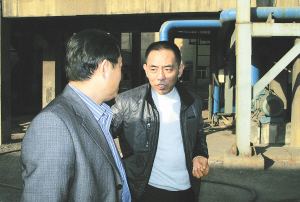 2010年11月22日,孟祥民(右)在双凤电厂询问企业负责人环保设施运行情况。 他一生坚守自己的价值观,金钱的诱惑从没使他逾越底线。被确诊患上结肠癌后,他选择在一场场环保攻坚战中,书写生命倒计时的辉煌。 他就是全国“环保卫士”,淄博市环保局淄川分局监察一科原科长孟祥民。 新华社发