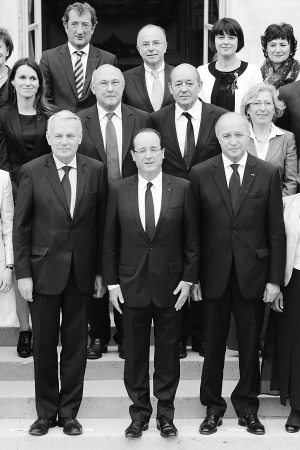 | 5月17日,法国新任总统奥朗德(前排中)和法国政府新内阁成员在巴黎爱丽舍宫出席首次内阁会议后合影。