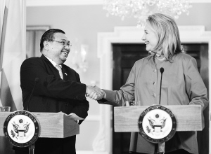 5月17日,在美国首都华盛顿,美国国务卿希拉里·克林顿(右)与缅甸外交部长吴温纳貌伦共同会见记者。 根据白宫发表的一份声明,美国总统奥巴马当天宣布提名德里克·米切尔担任美国驻缅甸大使。 新华社记者 张军 摄