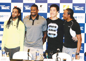 5月18日,2012年国际田联钻石联赛上海站举办媒体见面会,男子110米栏四名国际顶尖运动员:刘翔(右二)、梅里特(右一)、奥利弗(左二)和理查德森共同出席。刘翔在见面会上表示明天的比赛计划全力跑。 新华社发