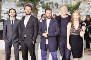 | 5月19日,主竞赛单元电影《无法无天》的演员(左起)希亚·拉博夫、贾森·克拉克、汤姆·哈迪、导演约翰·希尔科特和演员杰西卡·查斯坦亮相戛纳。 新华社记者 叶平凡 摄 |