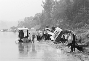 5月21日6时许,国道210线广西南丹县境内发生一起交通事故,一辆开往四川方向的海南客车与一辆开往广东方向的四川客车发生碰撞,致30多人受伤,其中4人受重伤。目前,伤者已全被送往医院治疗,事故调查和善后处理工作正在进行中。 新华社发(覃龙 摄)