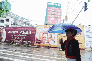 5月21日,一名小学生从拆迁现场附近街道走过。