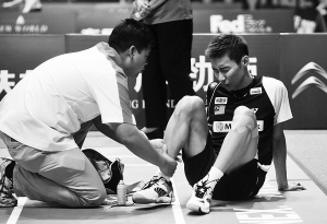 | 李宗伟(右)受伤后接受治疗。 新华社发 |
