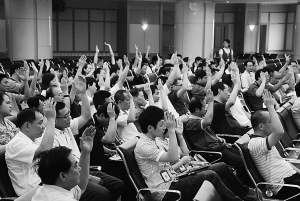 ①在2010年海南日报报业集团第四届六次职工代表大会上,集团职工代表以举手表决的方式通过集团薪酬制度。