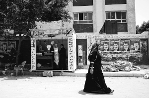 | 民众从街头墙上张贴的竞选海报前走过。 |