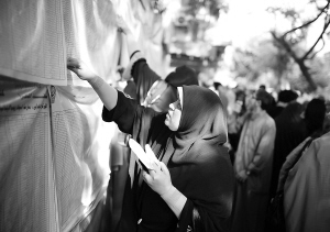| 一名妇女在一个投票站外查找自己的名字。 |