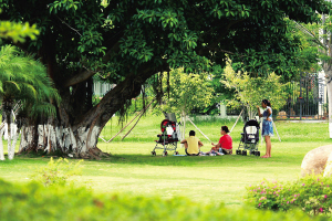5月22日,三亚月川大桥旁的小公园里,市民在榕树下乘凉。目前三亚人均公共绿地面积已达到18.97平方米。特约记者 孙清 摄