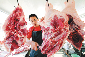 累计降幅达15.7% 据商务部日前发布的商务预报监测,上周商务部重点监测的食用农产品价格降幅扩大,其中猪肉价格比前一周下降1%,连续16周下跌,累计降幅达15.7%。 图为在山东省临沂市郯城县一家农贸市场,一名摊主在分解待售的猪肉。 新华社发