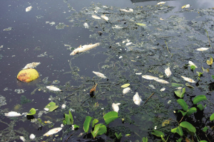 | 人工湖面上漂浮的死鱼。 孙清 摄 |