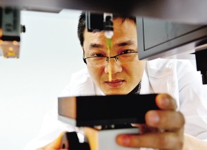 近日,中国石化集团四川维尼纶厂(简称川维厂)在重庆宣布,“3S特种水溶纤维”制造技术经过该厂长达9年的研发终获成功。这标志着中国继日本之后,成为世界上第二个拥有自主知识产权低温特种水溶纤维制造技术的国家。 据川维厂首席专家何云介绍,低温特种水溶纤维可与羊毛、棉麻混纺,提高可纺性、织造性,并能够用水纤维溶解去除,得到蓬松柔软的高级织物,还可以在织物上织出美丽多变的图案,其产生的无捻毛巾、内衣,触感柔软舒适。 新华社记者 刘潺 摄