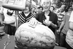 5月25日,在北京市大兴区庞各庄镇西甜瓜擂台赛现场,瓜农宋宝森(中)展示他种植的瓜王。 当天,来自河北、山东、天津、浙江等地的300多名种瓜高手带着精心培育的西瓜和甜瓜来到北京大兴区庞各庄镇,参加一年一度的全国西甜瓜擂台赛。最终,大兴瓜农宋宝森带来的西瓜以27.15公斤夺得单瓜重量瓜王奖。 新华社发