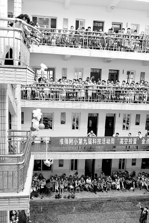 5月25日,安徽淮南师范附属小学举行第九届科技活动周“高空投蛋”金点子创新大赛。同学们充分调动创新思维,利用自己学习到的科技小知识,巧妙借助气球、海绵、塑料泡沫等材料自制降落道具,使生鸡蛋从高空投掷到水泥地上安然无恙。 新华社发