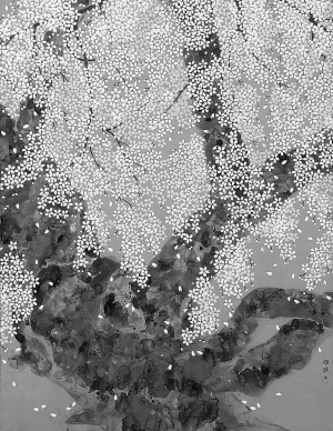 可以这样理解,“樱花系列”标志着林明俊在日本研习“岩彩画”多年后一个较为完整的句号,瑰丽多姿的色彩、缜密工致的刻划体现其尔雅的气质、扎实的功力及细腻的情感。“南国系列”是林明俊归国后的第一批以故乡海南本土题材为创作母题的作品,主题是诗意的,笔致是抒情的,色彩是清丽的,虽然形式技巧依然是外来的,但已开始摆脱“樱花系列”作品中侧重于形式美的追求而转向文化精神向度与厚度的勘探。对故乡的眷恋及深度理解使作品具有乡土的芬香,虽然是庭院一角,几株芭蕉,抑或一组热带花卉、水果,但在画家的静观下变得鲜活起来、润泽起来,闪烁着性灵的美。