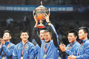 | 中国男子羽毛球队队员在汤姆斯杯颁奖仪式上。图为林丹举起汤姆斯杯奖杯。 新华社发