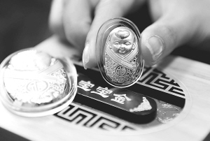 5月29日,工作人员在展示“宝宝金”。 近日,中国印钞造币总公司旗下中钞国鼎投资有限公司选用高纯度黄金、白银推出“龙年宝宝”———宝宝金、宝宝银系列金银投资新品。 新华社发(赵晶 摄)