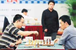| 29日,倪华(左)和周健超在中国海南儋州第三届国际象棋特级大师超霸战中。