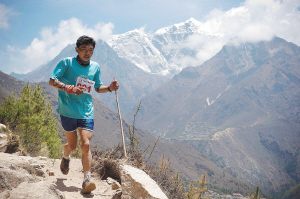 5月29日,世界最高海拔的马拉松比赛丹增-希拉里珠峰马拉松赛在珠峰南坡尼泊尔一侧地区开赛。这次马拉松的起跑线位于珠峰南坡大本营附近海拔5000多米的昆布冰瀑,终点在海拔3440米的纳姆切巴扎(“巴扎”意为市场),总长为标准的42.195公里,来自18个国家和地区的155名选手参赛。图为一名选手在比赛中。 新华社发