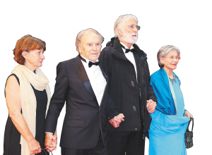 金棕榈奖获奖片《爱》的主创人员法国演员里瓦(右一)、奥地利导演哈内克(右二)、法国演员特兰蒂尼昂(左二)出席第65届戛纳国际电影节闭幕式。 新华社发