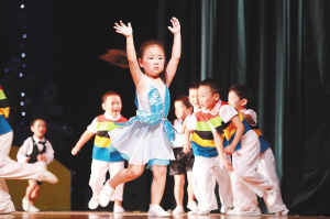 五月二十九日,海口布朗幼儿园的孩子们在海口市人大会堂表演舞蹈节目,庆祝六一儿童节来临。