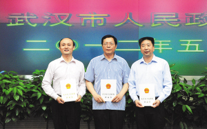5月29日,武汉市政府海选出的3位“布衣参事”拿到任命书。 今年4月16日,武汉市政府参事室首次启动“布衣参事”选聘工作,从所有对武汉经济、历史、文化有研究且热爱武汉的普通市民中选聘3位“布衣参事”。经过笔试和面试,以及评审组对考察人选“德、能、绩”等情况的综合考评,根据得分高低,最终从175名报名者中确定了3人为参事拟聘人选,并经过了公示。他们将与目前武汉市政府36位参事履行同样职责,拓宽政府和百姓之间的沟通渠道。 新华社记者 郝同前 摄