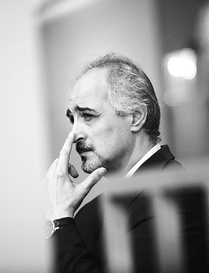 5月30日,安理会就联合国叙利亚监督团议题举行闭门磋商,听取了联合国负责维和事务的副秘书长拉德苏及联合国和阿盟叙利亚危机副特使让-马里·盖埃诺的汇报。 俄罗斯常驻联合国代表丘尔金30日在纽约联合国总部说,叙利亚各方都对叙危机恶化负有责任,目前没有任何一方执行了安南的建议,俄罗斯仍然反对制裁叙利亚。 图为叙利亚常驻联合国代表贾法里在安理会磋商结束后等在安理会会议厅外准备对媒体讲话。 新华社发