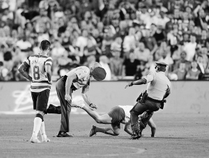 5月31日,在美国兰多弗进行的国际友谊赛中,美国队以1:4不敌巴西队。图为赛场执勤的警察扑向闯入球场的球迷。 新华社发