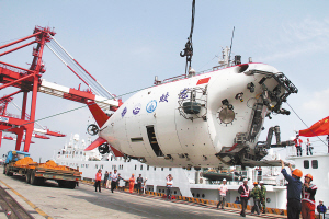 5月31日,“蛟龙号”载人潜水器被缓缓吊起,安装到“向阳红09”号科考船上。 当日,“蛟龙号”载人深潜器在江苏江阴的苏南国际集装箱码头顺利安装至试验母船“向阳红09”。“向阳红09”船将于6月3日载“蛟龙号”赴马里亚纳海沟向载人深潜7000米级海试发起冲击。 新华社发
