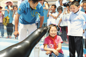 5月31日,青岛大麦岛小学的孩子们在极地馆与海狮互动游戏。 当日,部分生活在青岛的新市民子女应邀来到青岛海昌极地海洋世界参观游览,并如愿地与极地动物亲密接触。快乐的极地之旅,让这些常年跟随父母在外漂泊的孩子们,感受到了这座所居住城市的关爱与“六一”的祝福。 新华社记者 李紫恒 摄