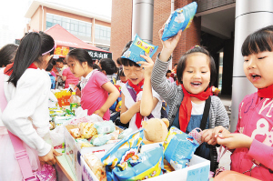 5月31日,在宁夏银川二十一小的校园内,几位小学生在练摊吆喝。 “六一”儿童节来临之际,宁夏银川市二十一小学举办了一场别开生面的“跳蚤市场”主题活动,小小读书郎摇身一变成了小摊主和淘宝客,有的摆起食品摊,有的叫卖自己闲置的玩具和书籍,孩子们在享受快乐节日的同时培养起自己的理财观念。 新华社记者 彭昭之 摄