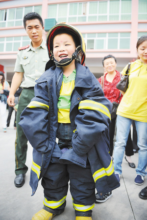 5月31日,一名小朋友正在试穿消防服装。当日,贵阳市小河区的百余名小朋友来到小河区消防大队,通过观摩消防演练、学习消防器材使用,使小朋友们增强了消防意识,度过了一个有意义的“六一”儿童节。 新华社记者 刘续 摄