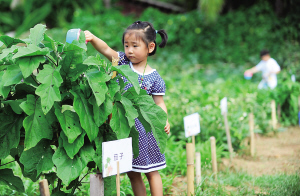 | → 6月1日,100多名儿童来到三亚亚龙湾红树林度假酒店稻草人农庄浇灌蔬菜。 本报记者 苏建强 摄 |