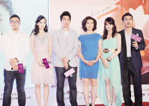 6月1日,韩延、Angelababy、赵又廷、江珊、袁咏琳、赵树海(从左至右)在电影《第一次》告白会活动现场合影。当日,电影《第一次》在北京举行宣传活动。该片将于6月8日正式公映。 新华社发