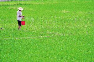 6月2日,一位三亚农民在为稻秧施肥。随着雨季的到来,海南进入三夏大忙时节,田野上到处都是农民抢播抢插的繁忙景象。 新华社记者 侯建森 摄