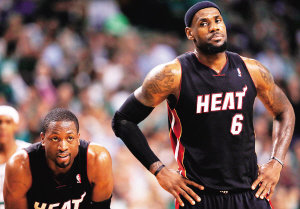 | 2日,在NBA季后赛东部决赛第三场比赛中,凯尔特人队主场战胜热火队,总比分追为1:2。图为热火队詹姆斯(右)与队友韦德在比赛中。 新华社发 |